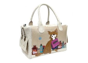 Сумка вместительная и удобная. внешне по бокам располагаются два кармана с клапанами в виде сумочек. аппликация располагается с 2-х сторон, на лицевой стороне - с участием длинношерстной чихуа-хуа. материал: натуральная кожа двух видов - телячья кожа телесного цвета и бело-серая с фактурой змеи. размер: 37+24+18 см. длина ручек 55 см. внутри 2 кармана на молнии и 2 открытых. None Есть доставка.