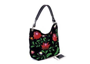 Стильная женская сумочка хохлома. «хохлома» — настоящая находка для любительниц замши и вместительных сумочек. эта модель сшита из натуральной замши чёрного цвета, которая сама по себе смотрится шикарно. фронтальная часть сумки украшена великолепной «хохломской росписью» — аппликацией из кусочков кожи. «изюминка» этого замшевого чуда от pelle volare — зелёные кожаные листики на центральной застёжке-молнии и боковом кармане, а также неожиданно яркая красная подкладка в тон аппликации. сумка выполнена из натуральной замши, аппликация - из натуральной кожи.