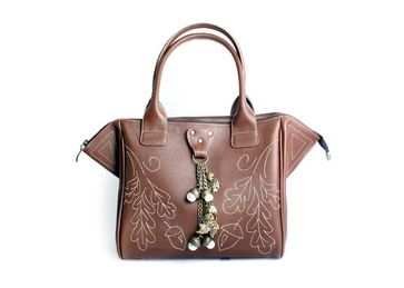 Стильная женская сумочка желуди. «жёлуди» — оригинальная модель, созданная для поклонниц кожаных сумочек с металлическими подвесками. фронтальная часть щедро украшена вышивкой, которая в комплексе с блестящим звенящим брелоком превращает этот, казалось бы, неброский аксессуар в необычную стильную вещь. ещё одна интересная деталь — боковые треугольные «ушки» с контрастной отстрочкой. для полезных и бесполезных мелочей, помимо основного отделения, предусмотрены ещё два закрывающихся на молнию кармана – внутренний и внешний, плюс миниатюрное отделение для телефона. сумка выполнена из натуральной кожи с декоративной вышивкой и брелоком.