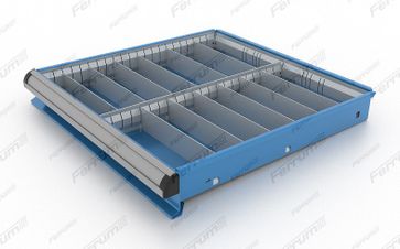 Делители L = 226 мм - 12 шт. Шаг делителей 20 мм. Высота ячейки 46 мм. Тип покрытия - порошковое эпоксидно-полиэфирное Цвет, RAL - 7001 Вес - 2,3 кг. Объем упаковки - 0,002 м2. Размер упаковки - 0,490 х 0,120 х 0,030h м. Возможность установки пластиковых ящиков None