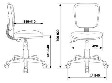 Характеристики: <br> Материал крестовины и колес: пластик.<br> Материал обивки: ткань.<br> Регулируемая высота сиденья: 410-540 мм.<br> Габариты сиденья (ШхГ): 415 х 380-410 мм.<br> Механизм регулировки высоты: газлифт.<br> Максимальная нагрузка: 100 кг.<br> None Страна производства: Россия