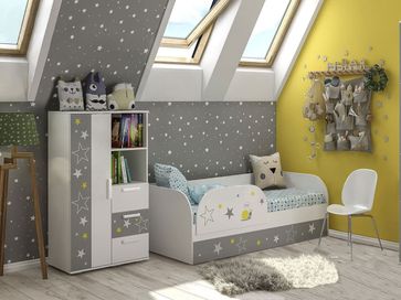 Детская кровать Трио с ПМ поможет организовать уютное спальное место в комнате вашего ребенка. Внутри кровати находятся два вместительных отделения для постельных принадлежностей или других вещей, к которым подъемный механизм обеспечит легкий доступ. Модель удачно дополнит любой современный интерьер, а вариант с рисунком украсит комнату и будет дарить хорошее настроение каждый день.<br> Характеристики: <br>Материал каркаса: ЛДСП.<br> Высота спального места от пола: 350 мм.<br> Рекомендуемая высота матраса: 180-200 мм.<br> Максимальная нагрузка на спальное место: 100 кг.<br> Габариты бортика (ВхШхГ): 396 х 894 х 16 мм.<br> Габариты короба для белья (ВхШхГ): 354 х 930 х 800 мм.<br> <br>
