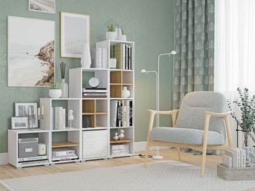Комплект стеллажей Лайт упорядочит хранение книг, игрушек, материалов для творчества и прочих необходимых ребенку вещей. В зависимости от конфигурации помещения модули можно поставить в ряд или распределить по всей комнате. Контрастные вставки могут быть расположены в любой секции каждого из модулей или убраны вовсе.<br>