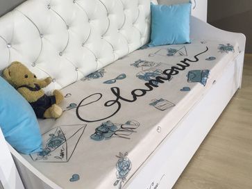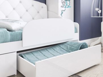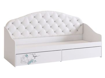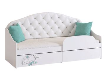 Детская кровать Гламур станет идеальным дополнением комнаты юной леди. Фасады с авторским рисунком декорированы глиттерным лаком, а стеклянные элементы инкрустированы кристаллами Swarovski. Две декоративные подушки в комплекте.<br> Характтеристики:<br> Материал каркаса: ЛДСП с кромкой ПВХ.<br> Материал фасадов: МДФ.<br> Материал обивки: искусственная кожа.<br> Рекомендованная высота матраса: до 180 мм.<br> Выкатные ящики на колесных опорах.<br> <br>