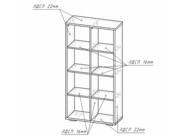 Характеристики <br> Материал корпуса: ЛДСП 22 мм с кромкой ПВХ 2 мм.<br> Материал стойки и полок: ЛДСП 16 мм с кромкой ПВХ 0,4 мм.<br> Материал опор: пластик.<br> None Страна производства: Россия