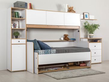 Характеристики: <br> Размер спального места (ШхГ): 800 х 1800 мм.<br> Материал корпусов и фасадов: ЛДСП 16 мм.<br> Материал ручек: пластик.<br> Тип направляющих: шариковые.<br> Дверцы шкафчиков кровати оснащены газлифтами.<br> Максимальная нагрузка на спальное место: 80 кг.<br> Высота спального места от пола: 550 мм.<br> Рекомендуемая высота матраса: 160 мм.<br> Дверца стеллажа навешивается на любую сторону.<br>