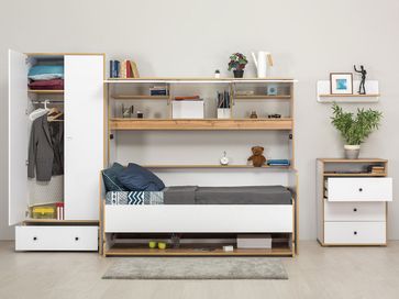 Детский шкаф Вуди поможет содержать в порядке все предметы гардероба ребенка. Широкая штанга развесит длинную одежду и не даст ей помяться. На полке удобно расставить коробки с несезонной обувью. Выдвижной ящик на плавных шариковых направляющих упорядочит постельные принадлежности и прочий детский текстиль.<br>