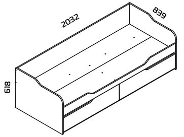 В комплект входят (ВхШхГ): <br> Кровать с ящиками: 618 х 2032 х 839 мм.<br> Навесная полка: 686 х 2048 х 280 мм.<br> Компьютерный стол: 752 х 1200 х 590 мм.<br> <br>