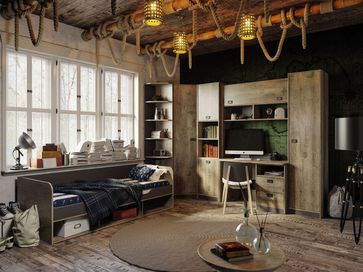 В комплект входят (ВхШхГ): <br> Кровать: 665 x 839 x 2032 мм.<br> Угловой шкаф: 2111 х 754 х 754 мм.<br> Шкаф-пенал: 2111 х 466 х 434 мм.<br> Письменный стол: 754 x 1210 x 590 мм.<br> Надстройка: 1295 x 1206 x 344 мм.<br> Торцевой стеллаж: 2111 x 305 x 434 мм.<br> Стеллаж: 2111 x 466 х 434 мм.<br>