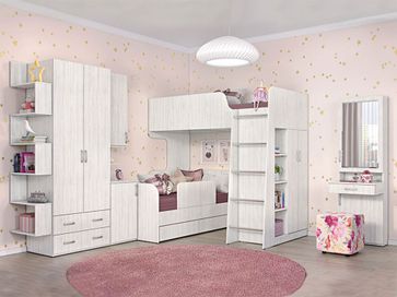 Комплект детской мебели Дарина поможет создать практичную и привлекательную атмосферу, которую по достоинству оценят маленькие принцессы. Отличительная особенность набора — два полноценных спальных места, поэтому в комнате могут расположиться сразу двое детей.<br>