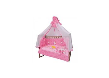 Комплект постельного белья в детскую кроватку.В комплект входит:защитный бортик (360х40см),балдахин (450х150см),одеяло (110х140см).подушка (40х60см),наволочка (40х60см),простыня (100х150),пододеяльник (110х140см).Подлежит машинной стирке. None
