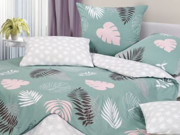 Комплект постельного белья Коломбина — стильное и оригинальное решение для спальни. Контрастная двусторонняя расцветка с тропическими листьями надолго сохранит яркость благодаря натуральным и стойким красителям. Для удобства заправки одеяла в пододеяльник вшита молния.<br>