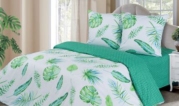 Комплект постельного белья Тропики — прекрасный вариант для обустройства спальной зоны в современном стиле. Ярко-зеленые пальмовые ветви станут привлекательным акцентом в любом интерьере.<br>