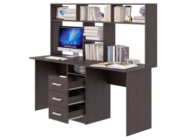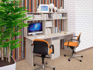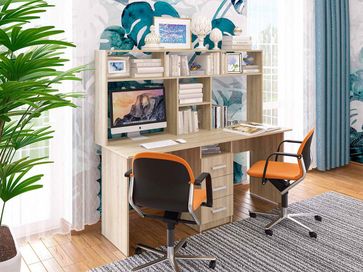 Компьютерный стол Оспиг — практичная модель с двумя равноценными рабочими зонами. Пространство под столешницей разделено тумбой с выдвижными ящиками, где удобно хранить канцелярские принадлежности, бумаги и разные мелочи. Для мониторов, папок и книг предусмотрены специальные ниши, поэтому каждое место оборудовано всем необходимым для работы или учебы.<br>