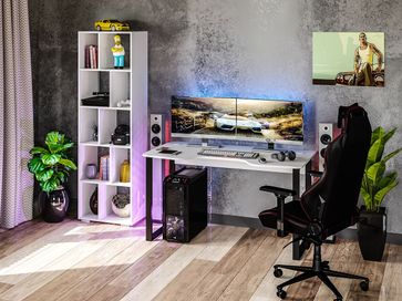 На компьютерном столе Кластер достаточно места для любой оргтехники или установки сразу двух мониторов. Металлические опоры обеспечивают прочность конструкции, а поверхность с анатомическим вырезом позволяет расположиться так, чтобы локти всегда оставались на столе. С обеих сторон предусмотрены отверстия с заглушками для вывода проводов.<br>