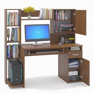 Удобный компьютерный стол с большим количеством полок.Такое решение прекрасно подойдет для организации места для учебы.В боковом стеллаже на нижней полке можно удобно разместить системный блок.За распашными дверками также находятся полки.Стол оборудован выдвижным ящиком и полкой для клавиатуры, которую можно не устанавливать, если вы планируете работать за ноутбуком.Высота полки под системный блок - 404 мм.Проем под монитор - 442х688 мм (под монитор 20”).Изделие универсальное при сборке - блок со стеллажом и блок с закрытыми полками можно расположить с любой стороны.Столешница изготовлена из ЛДСП отечественного производства толщиной 16 мм, отделана кромкой ПВХ 2 мм.Рекомендуем сохранить инструкцию по сборке (паспорт изделия) до истечения гарантийного срока. Работаем круглосуточно!Возврат 21 день. Страна производства: Россия Есть доставка.