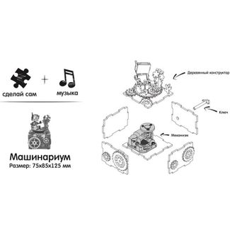 В набор включено всё необходимое для создания оригинального предмета Вашего интерьера. Внутри подарочной коробки Вы найдёте деревянные детали для сборки, механизм с музыкой и вращением, необходимые инструменты, клей и подробную пошаговую инструкцию. Все детали модели вырезаны лазером и идеально подходят друг к другу без дополнительной обработки. Готовая музыкальная карусель станет прекрасным элементом декора или оригинальным романтичным подарком близким людям.