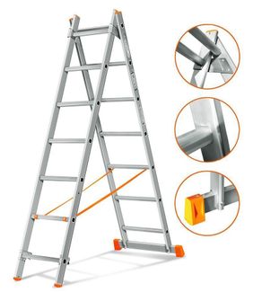Лестница двухсекционная Эйфель Гранит 2х6. На всех лестницах серии «Гранит» применена технология изготовления ступени «РЕБРО ЭЙФЕЛЯ», где противоскользящее рифление находится на ребре ступени, а не на плоскости. Направляющие выполнены из эргономичного восьмигранного профиля 62 Х 20 мм. Такой профиль удобно держать при переносе лестницы и при подъеме-спуске. Толщина профиля направляющих и поперечин 1,5 мм, ступени 1,4 мм. Благодаря граням на профиле поперечной траверсы, соединение с н...