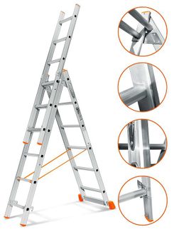 Лестница трехсекционная Эйфель Гранит 3х6, конструкция которой позволяет работать с одной выдвинутой секцией. Применена технология изготовления ступени «РЕБРО ЭЙФЕЛЯ»: противоскользящее рифление находится на ребре ступени, а не на плоскости. Направляющие выполнены из эргономичного восьмигранного профиля 62х20мм. Такой профиль удобно держать при переносе лестницы и при подъеме-спуске. Толщина профиля направляющих и поперечин 1,5 мм, ступени 1,4 мм. Благодаря граням на профиле поперечн...
