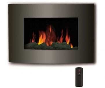 Электрический камин выполнен в современном стиле. Корпус электрокамина выполнен из металла, лицевая панель — полукруглое закаленное стекло черного цвета с прямыми краями.