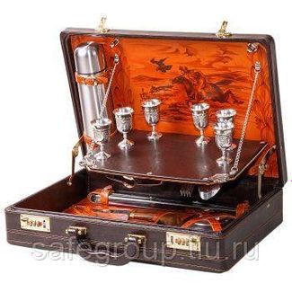 Набор подарочный "Классик" (6 персон) Подарочный набор "Классик" (6 персон) состоит из: Кейс с внутренней отделкой из натуральной кожи с росписью ручной работы и откидным столиком: 1 шт.; Термос из нержавеющей стали 0,5 л: 1 шт.; Фляжка из нержавеющей стали 0,5 л: 1 шт.; Вилки из нержавеющей стали: 6 шт.; Ложки из нержавеющей стали: 6 шт.; Рюмки из стали с никель-серебряным покрытием: 6 шт.; Мангал складной из нержавеющей стали: 1 шт.; Шампура из нержавеющей стали: 6 шт.; Нож-тяпка из нержавеющей стали и рукоятью из ореха и латуни: 1 шт.; Нож охотничий из нержавеющей стали и рукоятью из ореха и латуни: 1 шт.; Штопор сомелье: 1 шт.; Тарелки из нержавеющей стали: 6 шт.; Зажигалка: 1 шт.; Воронка из нержавеющей стали для заполнения фляжки: 1 шт.; Фонарик светодиодный: 1 шт.; Чехол для кейса из высокопрочного прозрачного пластика предназначенный для защиты от влаги и сохранения товарного вида: 1 шт.; Арт.: 101КИ6 None