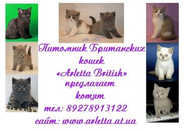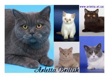 Питомник британских кошек "Арлетта Бритиш" постоянно предлагает британских котят шоу- и брид-класса от импортированных титулованных производителей. Все наши животные имеют титул не ниже Международный Чемпион. Мы занимаемся различными окрасами (шоколадный, лиловый, голубой, поинтовый, биколор (голубой с белым, лиловый с белым, черный с белым)). Котята с хорошей родословной. Милые, ласковые, крепкие по костяку, хорошая плюшевая шубка. Котята покидают наш дом уже приученые ко всем хорошим манерам, привитые, чипированные. Цены на котят разные все зависит от самого котенка и для каких целей вы его приобретаете. Возможна доставка в другие регионы. С информацией можно познакомиться на сайте www.arletta.at.ua