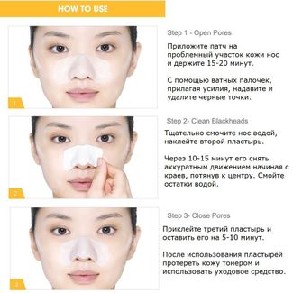 Шаг №1: приложите патч на проблемный участок кожи нос и держите 15-20 минут. С помощью ватных палочек, прилагая усилия, надавите и удалите черные точки. Шаг №2: далее тщательно смочите нос водой,наклейте второй пластырь, через 10-15 минут его снять аккуратным движением начиная с краев, потянув к центру. Смойте остатки водой. Шаг №3: приклейте третий пластырь и оставить его на 5-10 минут. После использования пластырей протереть кожу тонером и использовать уходовое средство.