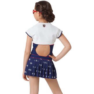 Детский пляжный комплект. Очаровательное белое балеро с короткими рукавами декорировано синей окантовкой на рукавах и золотыми пуговками, а также нашивкой-гербом по задней детали. И кокетливая юбка в густую складку на однотонном поясе, украшенном золотыми пуговками и нашивкой-гербом. Юбка выполнена глубоком синем цвете с принтом «Штурвалы». Комплект великолепно дополняет любой купальник коллекции. None