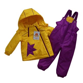 Яркий демисезонный костюм для прогулок в холодное время года. Куртка имеет 2 молнии: короткую - не разъемную и длинную - разъемную. На полочке карман декорирован звездой, рукава на резинке. По низу изделия проложен шнур для утяжки. Капюшон имеет утяжку, на кнопках и при необходимости отстёгивается. Полукомбинезон для размеров 80-98 см имеет дополнительную резинку для обуви, а низ штанины на резинке.Для размера 104-110 см штаны прямые с ветрозащитным манжетом. Утеплитель синтепон-люкс 150гр/м2, ткань верха Deuspo. Подклад: рр80-98см - мягкий флис и хлопок 100%, рр104-110см - мягкий флис и полиэстер 100%. Температурный режим от 0 до +15.Внимание! Фактический цвет изделия может незначительно отличаться от цвета на фотографии в связи с особенностями цветопередачи различных цифровых устройств. None