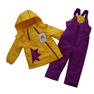 Куртка и полукомбинезон, ткань водоотталкивающая, плащевая. Подкладка на куртке – мягкий флис. Утеплитель – синтепон 150 г/кв.м. Куртка имеет 2 молнии: короткую (неразъемную) и длинную (разъемную). На полочке 1 карман, декорирован звездой. Низ утягивается, рукава на резинке. Подклад у полукомбинезона (штанины) – мягкий флис или полиэстер, куртка – мягкий флис, низ на резинке. Капюшон на кнопках, при необходимости отстёгивается. None