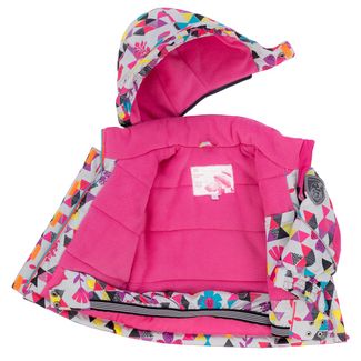 Яркий костюм для девочки с геометрическим принтом. На куртке два прорезных кармана, а также на левом рукаве кармашек для мелочей. На манжетах имеются липучки - утяжки. Также у куртки есть внутренняя защита от продувания. Полукомбинезон имеет усиление на коленях и ягодицах. Пояс можно регулировать по ширине, лямки можно отстегнуть. Комплектация: куртка, полукомбинезон, шарф (флис). Количество наполнителя Aerofiber от фирмы Dupont: