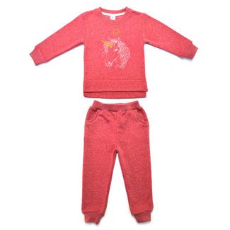 Спортивный костюм для маленькой принцессы (от 18 месяцев до четырех лет). Цвета невызревшей малины, со сказочным единорогом, который вышит на кофточке. У нее прямой крой, чуть удлиненная спинка. Штанишки с резинками на поясе и по низу, с карманами. Для пошива комплекта выбран уютный петельчатый футер (100% хлопок), нежный, теплый и долговечный. None