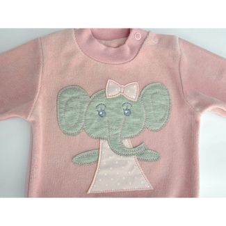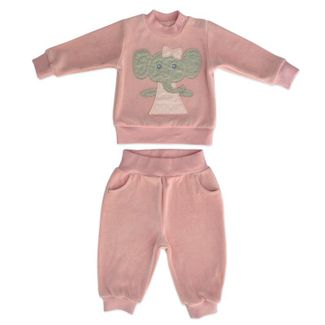 Розовый велюровый костюм для девочки, состоящий из свободных штанишек на резинке и кофточки с длинным рукавом и удобной застежкой на плече. Маленьким модницам понравится нежный розовый цвет и забавная аппликация в виде слоненка, а родителей порадует высокое качество материала. Мягкая ткань хорошо тянется, поэтому в костюме будет комфортно двигаться и играть. None