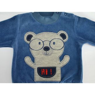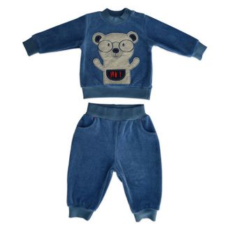 Костюм для мальчика, состоящий из кофточки с длинными рукавами и штанишек на резинке. Мягкая велюровая ткань очень приятна на ощупь, не трет и не раздражает нежную кожу малыша. Синий цвет костюма, аппликация в виде забавного медвежонка и удобные карманы на штанишках сделают этот комплект любимой одеждой вашего непоседы. Кофта имеет удобную застежку на плече и мягкие трикотажные манжеты None
