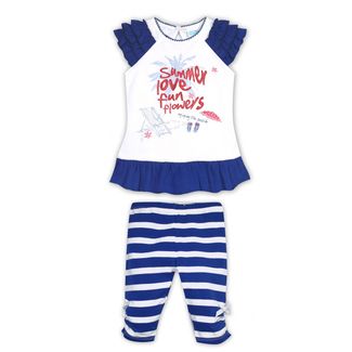 Комплект (туника и лосины) Lebe выполнен в бело-синих цветах. Рукава-крылышки и низ туники оформлены воланами. Изделие декорировано принтом с блестками. Лосины в полоску, с поясом на резинке, сборкой и бантиком внизу брючин. Состав: 100% хлопок. Внимание! Фактический цвет изделия может незначительно отличаться от цвета на фотографии в связи с особенностями цветопередачи различных цифровых устройств. None