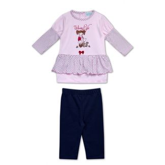Комплект для девочки (туника и лосины) Lebe выполнен из 100% хлопка. Туника декорирована принтом на груди. Волан, отрезные рукава и воротничок оформлены узором в горошек. Лосины темного цвета на резинке. Внимание! Фактический цвет изделия может незначительно отличаться от цвета на фотографии в связи с особенностями цветопередачи различных цифровых устройств. None