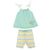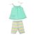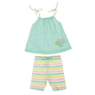 Мягкий комплект из майки и шорт.Майка стильного мятного цвета, расширенная к низу. Верх на резинках и регулирующихся завязках. Украшена резиновым принтом с бабочками.Пояс шорт на резинке с регулирующей тесьмой. Ткань в полоску пестровязанная, не потеряет цвет после стирок. None Можно купить без предварительного заказа.