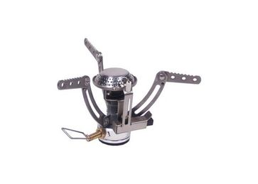 Сталь. burner, foldable pot stand, aluminium valve, electronic ignition included, wire control knob for compact storage, plastic storage box included, fit for screw-on valve gas bottle, Output: 1800 W, Weight: 115 g, Size, fold: ca. 66 x 63 x 83 mm None