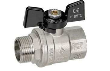 Кран шаровой латунный, полнопроходной, резьбы внутренняя - наружная (соединитель с накидной гайкой) по ISO 228/1. Ручка - "бабочка" из алюминия