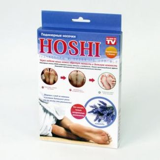 Японские педикюрные носочки HOSHI - это новшество японской косметологии.Носочки разработаны специально для домашнего педикюра. Теперь свое свободное время и деньги можно планировать совсем по-другому. Если нет времени, сил или желания на салон красоты - педикюрные носочки это Ваш выбор. Никакой химии и кислот! При производстве мы используем только натуральные компоненты, которые созданы природой! Состав: Фиалка трехцветная, одуванчик, сакура, вереск, масло чайного дерева, мелисса, алоэ барбадосское, масло ши, календула, жасмин самбак, брусника Именно такой природный лекарственный состав воздействует на кожу ног, делая их мягкими. За счет своих компонентов, носочки практически не имеют противопоказаний. Категорией, которым не желательно надевать носочки HOSHIстановятся беременные женщины и кормящие матери. Японские носочки HOSHI позволяют проводить педикюр без временных затрат. Вот те проблемы, которые легко готово раскусить японское «чудо»: Натоптыши и мозоли Грубая ороговевшая кожа Отеки Грибковые заболевания. Говоря в целом, после того, как Вы решитесь использовать носочки HOSHI для педикюра, кожа станет ровной и гладкой, словно у младенца. А все это потому, что носочки обладают следующими свойствами: Стимулируют обменные процессы в организме человека В разы увеличивают активность клеток Сокращают отеки Имеют противовоспалительное действие Нормализуют потовые выделения и деятельность сальных желез Оказывают противогрибковый эффект Делают кожу упругой и эластичной Ликвидируют трещины, мозоли, натоптыши и потертости Предотвращают возникновение грубой кожи. Использовать носочки HOSHI очень просто. Нужно лишь выбрать подходящее время, надеть носочки на ноги и носить 1-2 часа в зависимости от состояния кожи,но практика показала, что после 2-х часовой процедуры эффект достигается лучше, после чего снять их и принять теплый душ. Через неделю кожа с ножек будет постепенно «слазить», а затем Вы сможете на протяжение 2-3 месяцев наслаждаться идеально гладкими