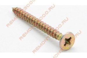 Потайная головка. Крестообразный шлиц Pozi. Острый наконечник. Крупная резьба. Желтопассированный. Используется для крепления дерева, ДСП, ДВП и других материалов.
