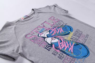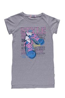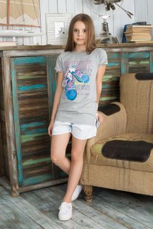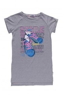 Удлиненная футболка для девочки Luminoso серого цвета, с ярким принтом и стразами. 95 хлопок, 5 эластан. Минимальная сумма заказа 1500 руб. Возможен самовывоз. Есть доставка.