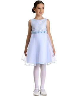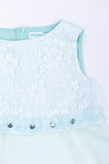 Платье Мадама Амели Нежный цветок голубое - очаровательный праздничный наряд с завышенной талией, лифом, выполненным из гипюрового кружева и двойной юбкой, верхний слой которой изготовлен из сетки-манки. Модель украшена широкой репсовой лентой с рюшей и стразами. Застегивается сзади на потайную молнию. Для детей от 3 до 7 лет. Минимальная сумма заказа 1500 руб. Возможен самовывоз. Есть доставка.