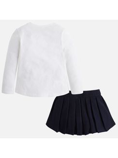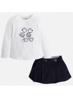 Комплект Mayoral для девочки состоит из легкого лонгслива с длинными рукавами и короткой стильной юбки. Юбка спереди застегивается на запах, а сзади имеет кокетливые складки. Лонгслив молочного цвета украшен долговечным дизайнерским принтом. Трикотаж, из которого сделан комплект, не садиться и не теряет цвета во время стирки. Наличные, Visa/MasterCard, Яндекс.Деньги, WebMoney Возможен самовывоз. Есть доставка.
