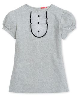 Футболка Pelican декорирована нежным сетчатым жабо, которое декорировано контрастной бархатной тесьмой по краю и тремя пуговицами. Модель приталенного силуэта и рукавами фонариками отлично дополнит школьный гардероб. Сзади застёжка капелька. Минимальная сумма заказа 1500 руб. Возможен самовывоз. Есть доставка.