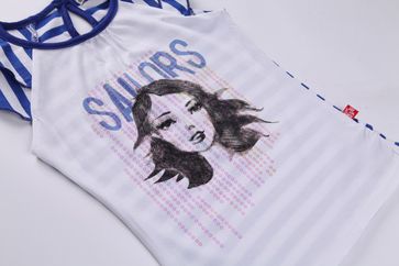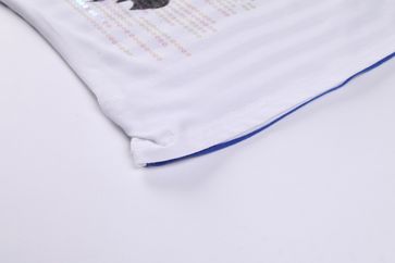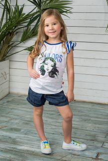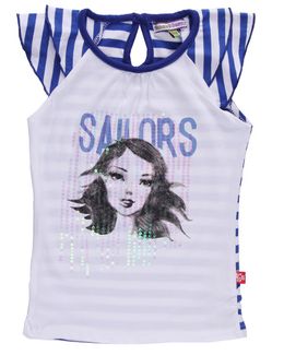 Футболка бело-синяя с паетками Sweet Berry выполнена из мягкого и приятного к телу хлопкового трикотажа, будет по достоинству оценена юной модницей. Модель оригинального кроя застегивается на спинке на пуговицу, спереди декорирована принтом с пайетками. Минимальная сумма заказа 1500 руб. Возможен самовывоз. Есть доставка.