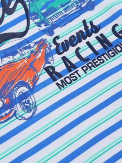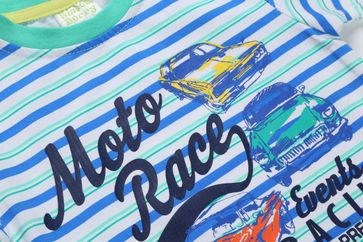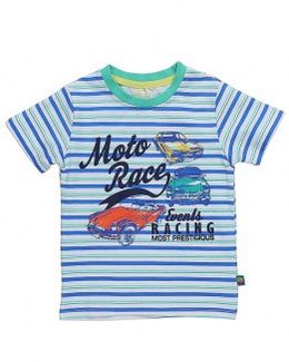Футболка Sweet Berry Moto raceизготовлена их хлопчатобумажного полотна в цветную полоску. На горловине трикотажная обтачка бирюзового цвета. Спереди цветной принт, в боковом шве фирменная лейба. Минимальная сумма заказа 1500 руб. Возможен самовывоз. Есть доставка.