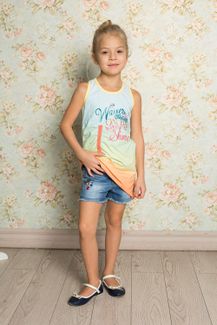 Майка Sweet Berry удлиненная Желто-бирюзовая имеет оригинальный крой и стильный дизайн. которые будут по достоинству оценены юной кокеткой. Модель с округлой горловиной имеет асимметричный низ, декорирована буквенным принтом и кружевом на спинке. Майку можно выгодно комбинировать с шортами, леггинсами и джинсами. Минимальная сумма заказа 1500 руб. Возможен самовывоз. Есть доставка.