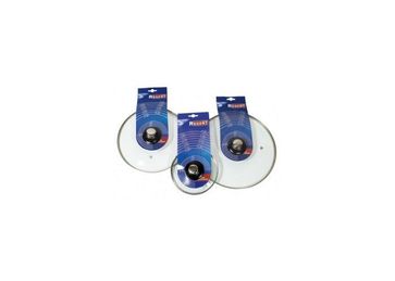 Стеклянная крышка с металлическим ободком, пластиковой ручкой и пароотводом. None