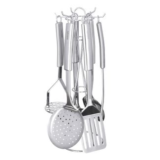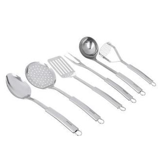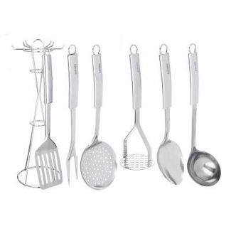 Набор кухонных принадлежностей из нержавеющей стали. Состоит из семи принадлежностей, выполненных в одинаковом дизайнерском решении. Приборы выполнены из нержавеющей стали, можно использовать их для посуды с антипригарным покрытием. Ручки приборов снабжены отверстиями для подвешивания. None Возможен самовывоз. Есть доставка.